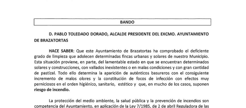 El alcalde, Pablo Toledano, ha emitido el siguiente bando en el que insta a proceder con la limpieza de solares y parcelas privadas de pastizales, fundamentalmente por motivos preventivos ante el gran riesgo de incendios del presente verano.