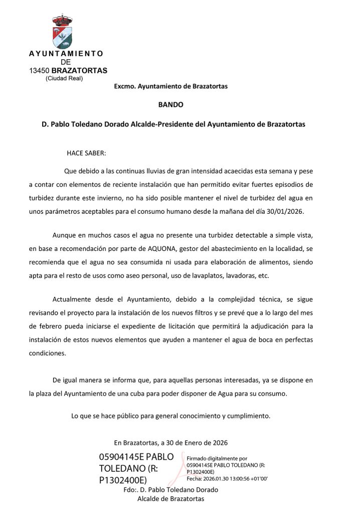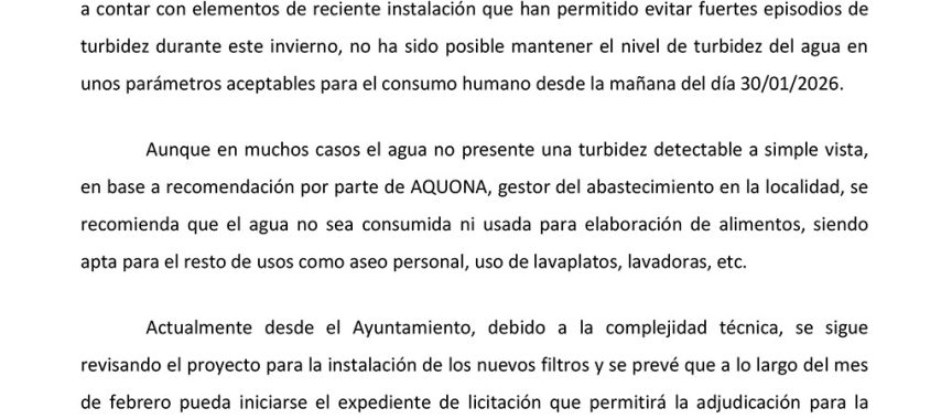 El alcalde, Pablo Toledano, de acuerdo con lo apuntado desde AQUONA al Ayuntamiento, informa a la ciudadanía sobre la situación actual de la calidad del agua de la red de abastecimiento:
